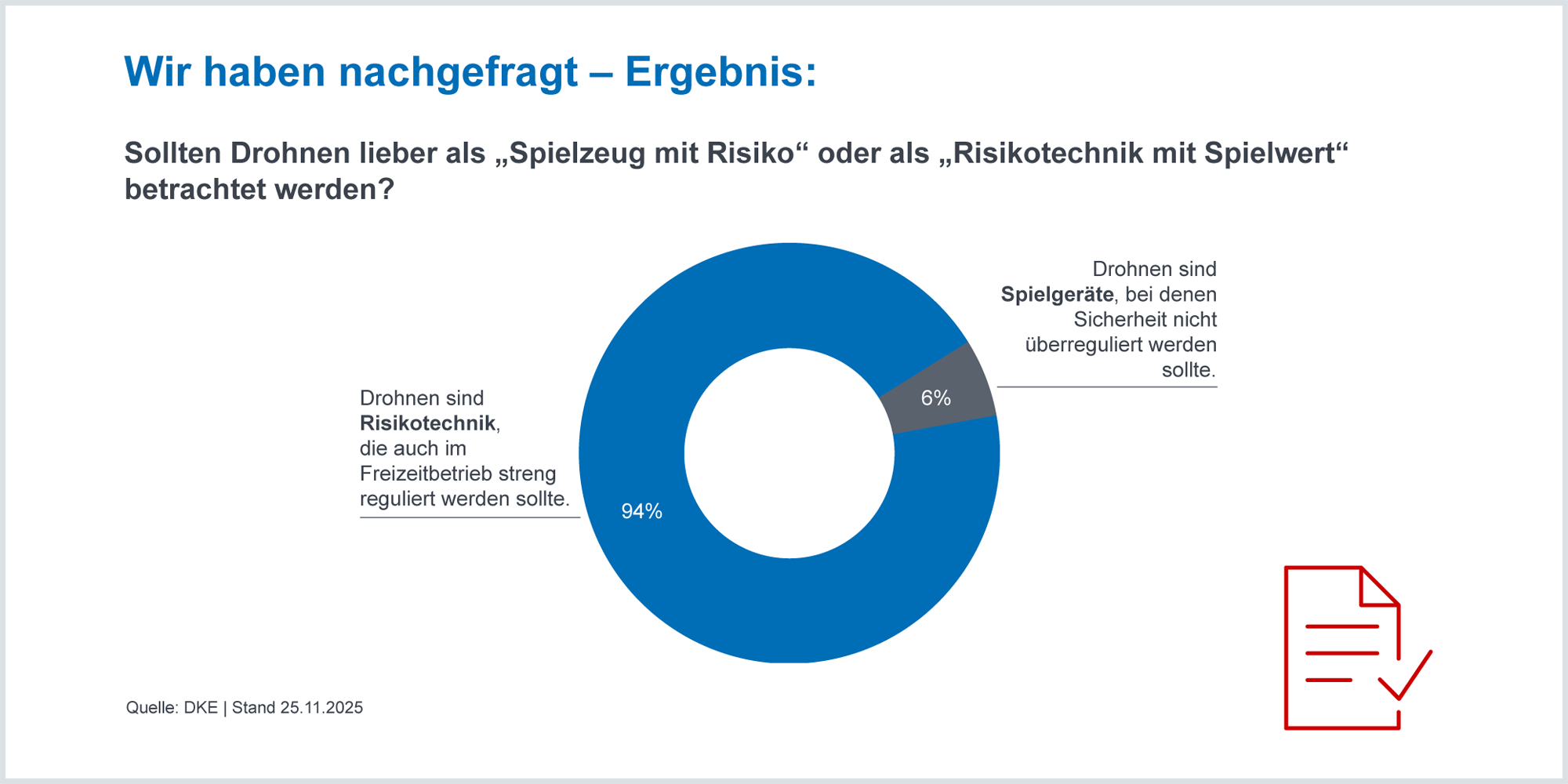 94 Prozent der Teilnehmenden sehen Drohnen als eine Risikotechnik, die auch im Freizeitbetrieb streng reguliert werden sollte. 6 Prozent der Teilnehmenden betrachten Drohnen als Spielgeräte, bei denen die Sicherheit nicht überreguliert werden sollte.