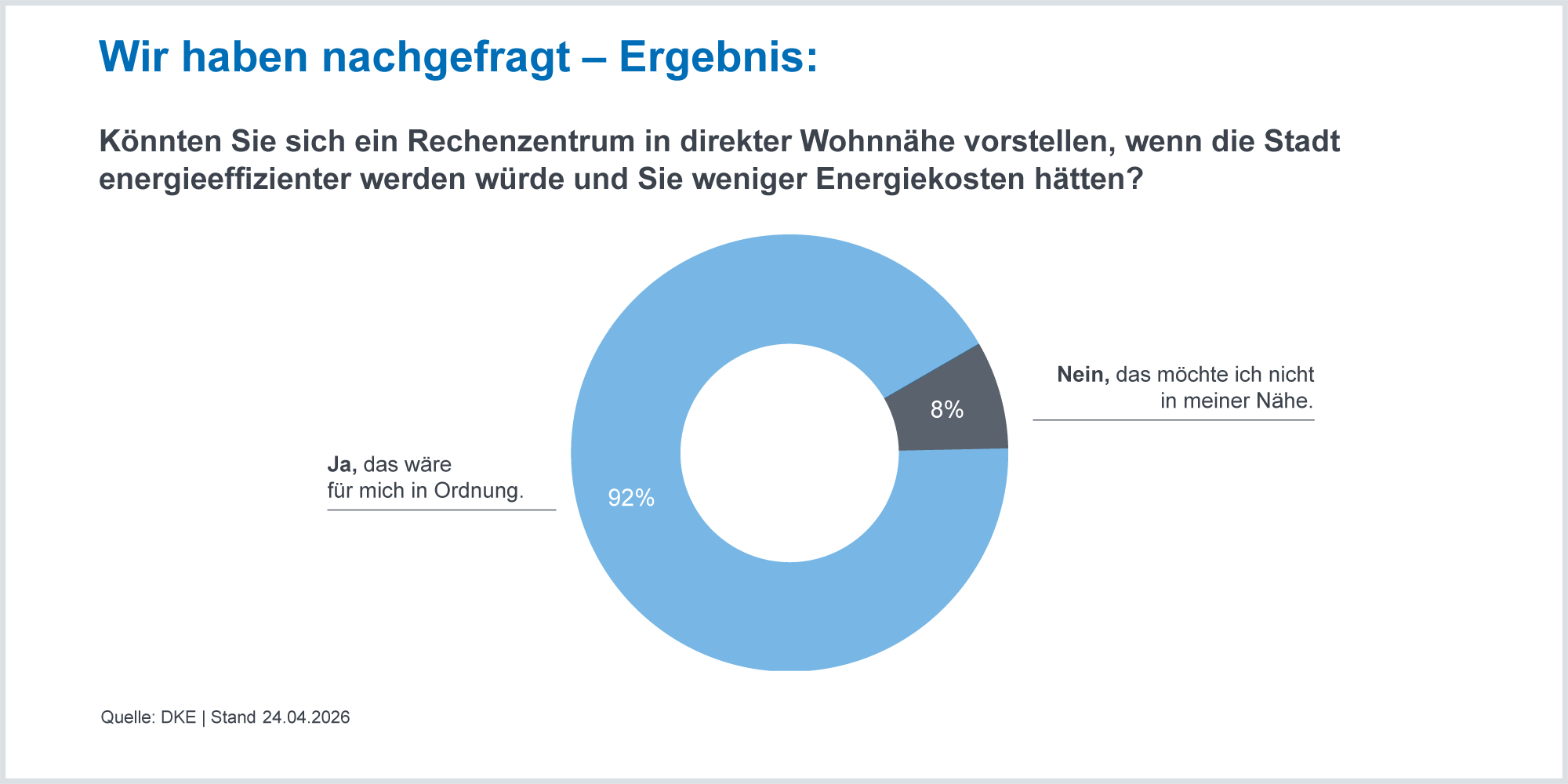 Künftig sollen Rechenzentren näher an Ballungsräumen entstehen, um Energie effizienter zu nutzen und Abwärme direkt für die lokale Wärmeversorgung einzusetzen – zugleich prägen sie stärker das Stadtbild und den Wohnraum. Unsere Umfrage im DKE Newsletter zeigt: 92 Prozent der Teilnehmenden fänden ein Rechenzentrum in Wohnnähe akzeptabel; 8 Prozent lehnen dies ab.