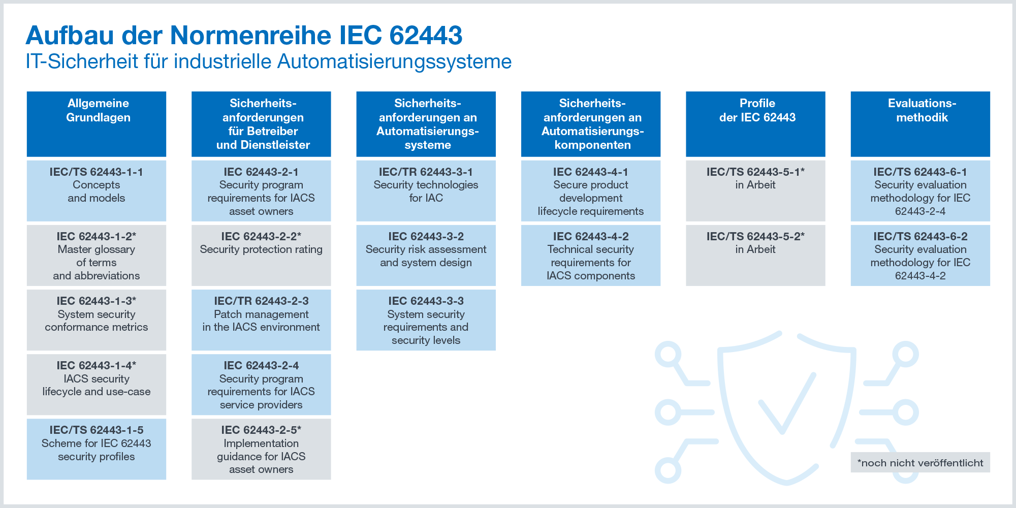 Teil 2-1 der Normenreihe definiert die Elemente, die für den Aufbau eines Informationssicherheits-Managementsystems (ISMS) für industrielle Automatisierungs- und Steuerungssysteme (IACS) notwendig sind, und gibt einen Leitfaden für die Entwicklung dieser Elemente. Dieses Dokument verwendet die breit angelegte Definition und den Anwendungsbereich für ein IACS nach IEC 62443-1-1.