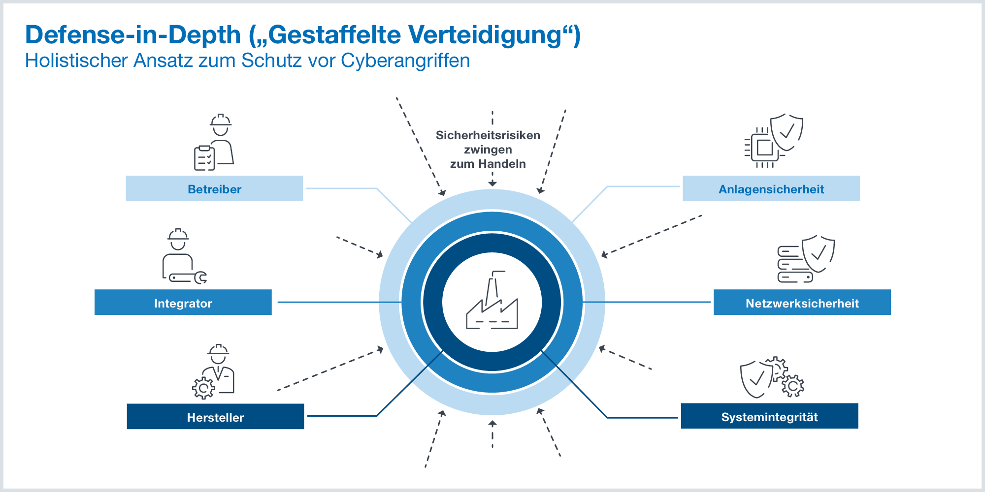Das Rahmenwerk bildet die Struktur für die Evaluation der Defense-in-Depth-Strategie des IACS im Betrieb auf der Grundlage der technischen und organisatorischen Anforderungen, die in anderen Dokumenten der IEC-Normenreihe 62443 spezifiziert sind.