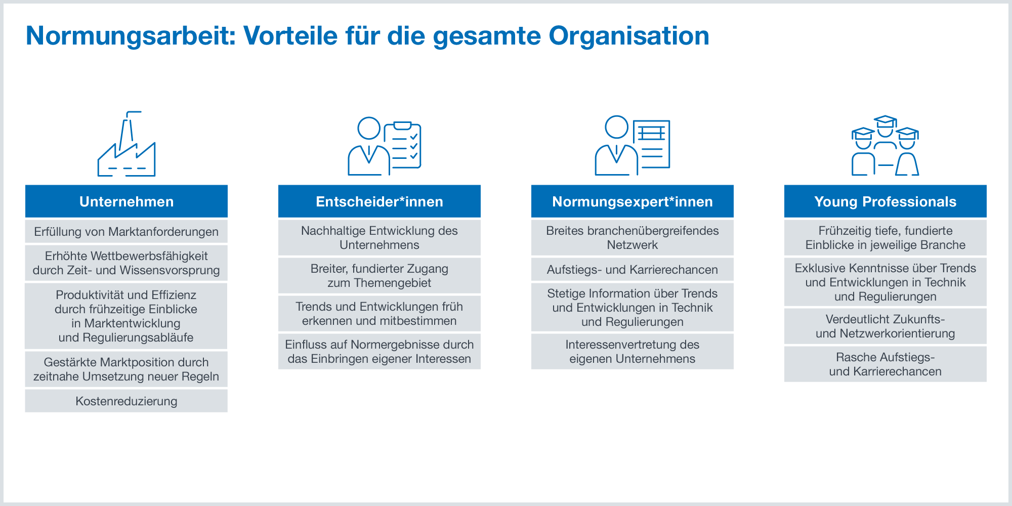 Unsere Welt verändert sich rasant, hierbei wollen wir in jeder Situation Fortschritt und Sicherheit genießen, egal ob am Arbeitsplatz oder in der Freizeit. Dies erreichen wir durch die Erarbeitung und Anwendung von nationalen, europäischen und internationalen Regeln, die für die Gesellschaft von hoher Bedeutung sind, da sie Orientierung, Sicherheit und Klarheit geben: Normen und Standards.