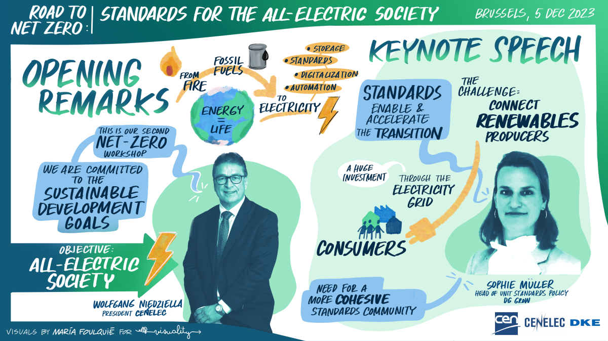Um der Frage auf den Grund zu gehen, trafen sich hochrangige Vertreter*innen aus der Industrie, von europäischen Institutionen, Normungsorganisationen und der Zivilgesellschaft in Brüssel. CEN (Europäisches Komitee für Normung) und CENELEC (Europäisches Komitee für elektrotechnische Normung) gemeinsam mit DKE (Deutsche Kommission für Elektrotechnik, Elektronik und Informationstechnik) veranstalteten hierzu am 5. Dezember 2023 den Workshop mit dem Titel ‚Road to Net Zero: Standards for the All-Electric Society‘.