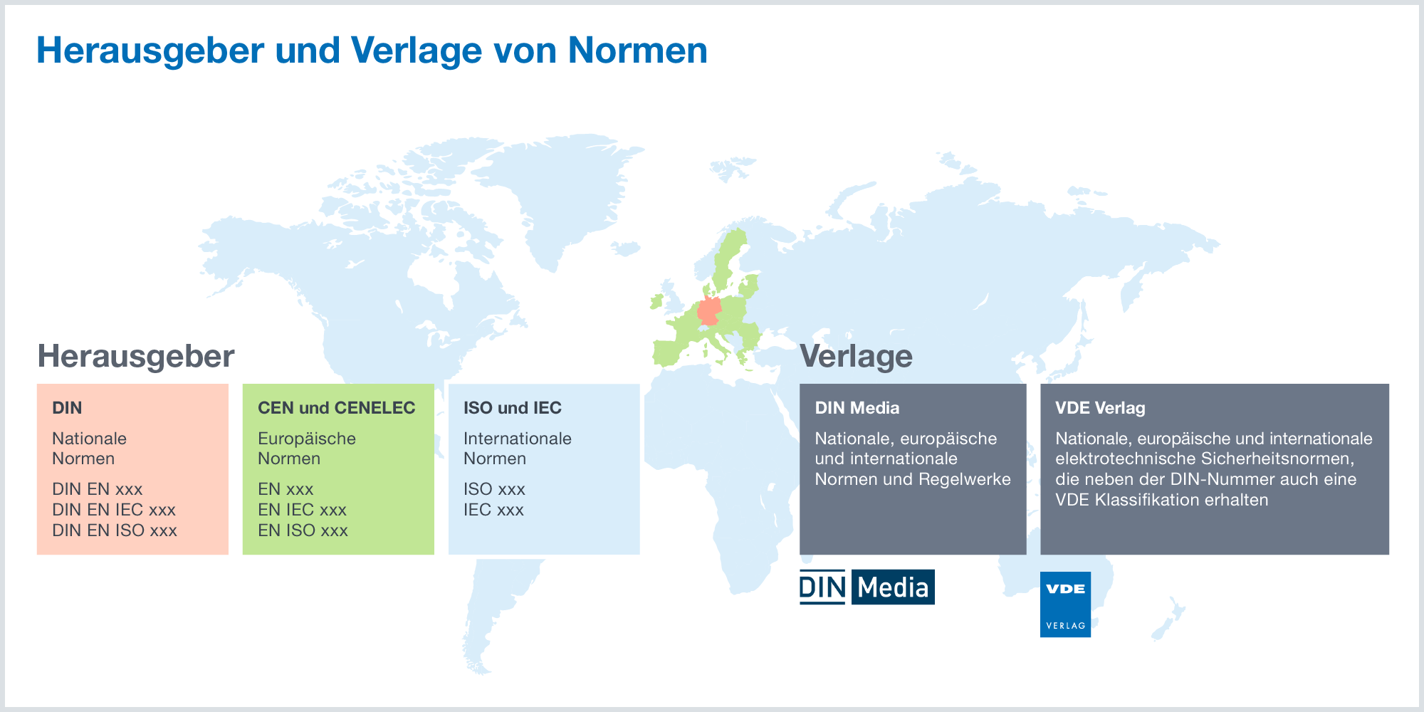 Wer gibt nun eigentlich Normen heraus? Je nach Erarbeitungs- und Geltungsbereich einer Norm – ob national, europäisch oder international – sind spezielle Normungsorganisationen schlussendlich die Herausgeber der Normen und entsprechende Verlage für deren Verkauf zuständig.