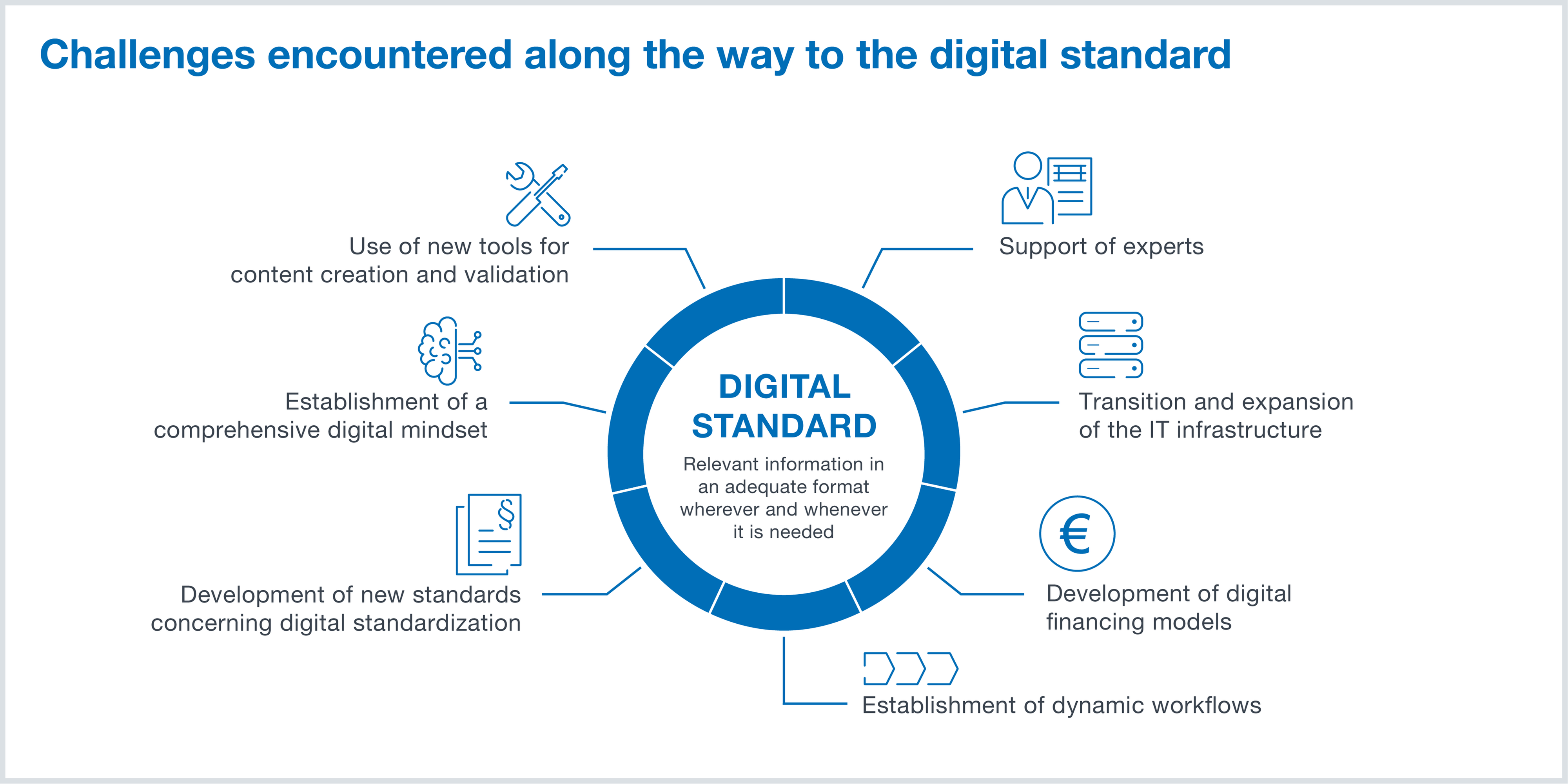 For the digital standard to become a reality, there needs to be a comprehensive digital transformation of current standards and, naturally, standards organizations. Such fundamental changes constitute a complex transformation process, within which a progression towards the goal of a digital standard must occur in numerous small steps. Standards organizations, industry, research and standards users worldwide are thereby confronted with seven significant challenges: